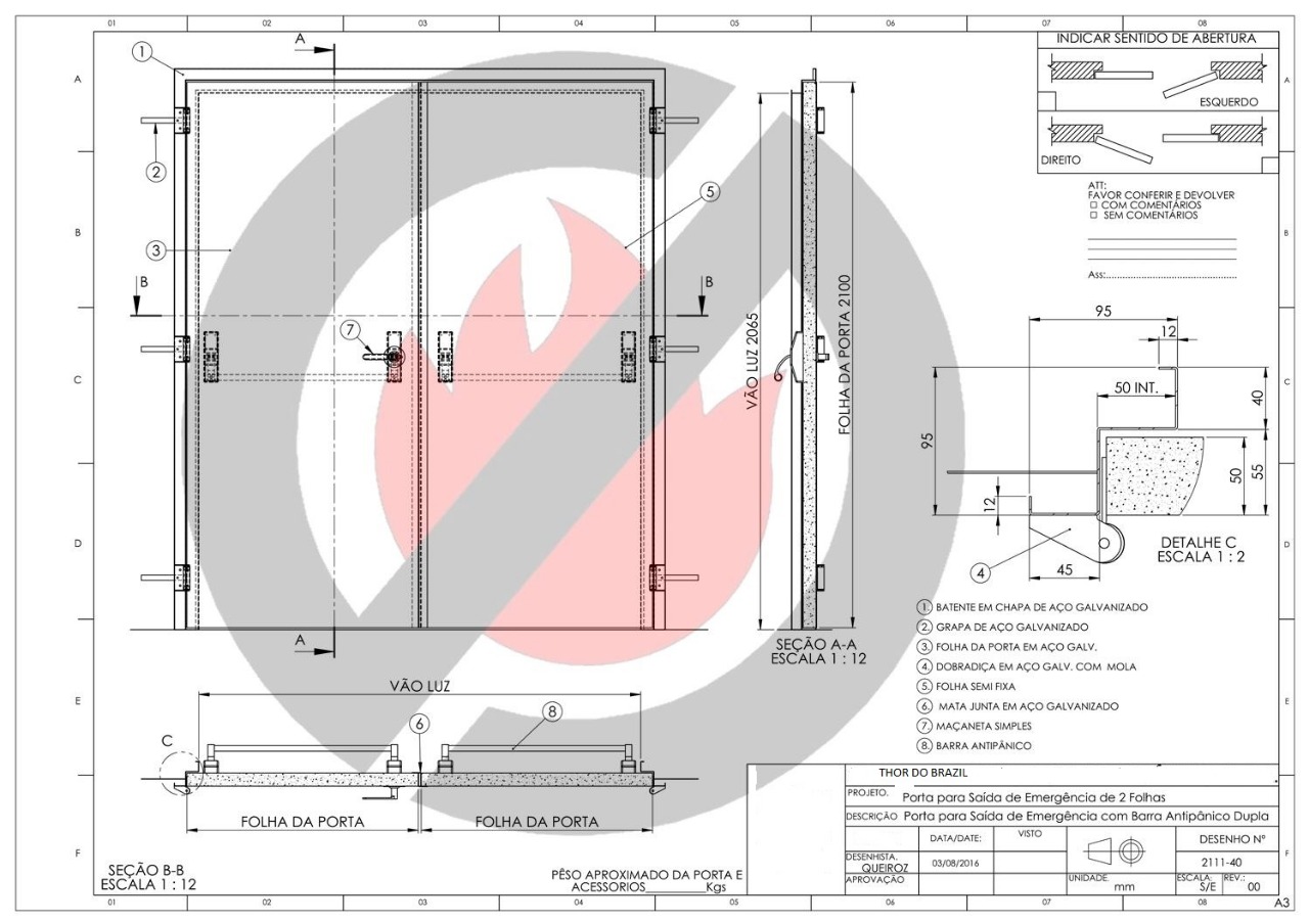 Porta fabricada com chapa galvanizada composta de duas chapas externas, estrutura reforçada em todo seu perímetro, núcleo interno resistente conforme a classe escolhida. Todos as portas têm selo de conformidade da ABNT e selo do fabricante que garante rastreabilidade das matérias primas em caso de necessidade.